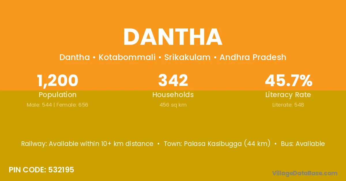 The literacy rate of Dantha village is 65.43%. Male literacy stands at 84.73% and female literacy at 48.85%.