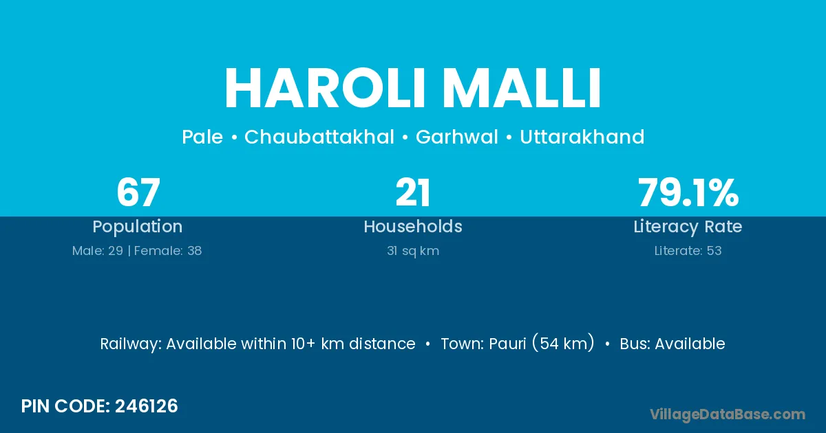 Pauri (54 km) is the nearest town to Haroli Malli village for major economic activities and is located approximately 54 km away.