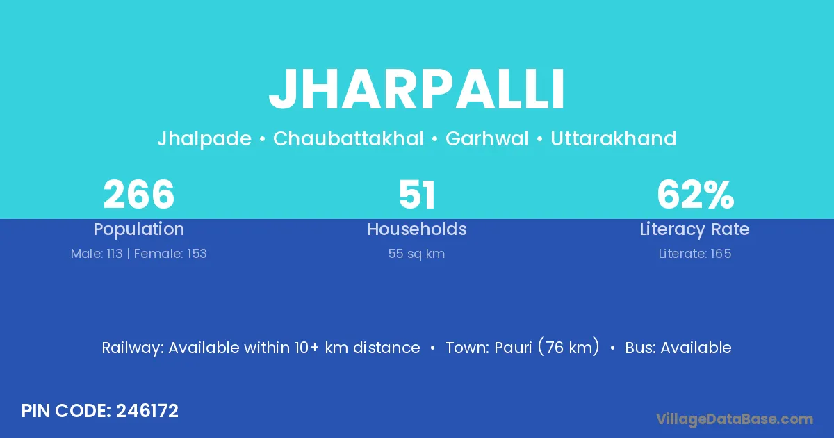 Pauri (76 km) is the nearest town to Jharpalli village for major economic activities and is located approximately 76 km away.