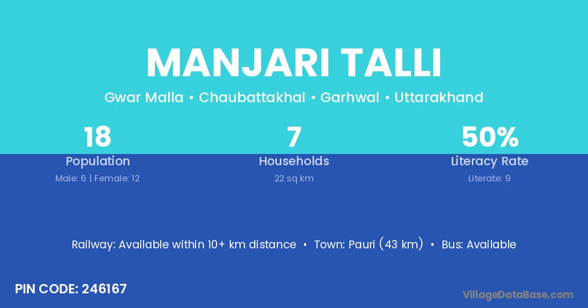 Pauri (43 km) is the nearest town to Manjari Talli village for major economic activities and is located approximately 43 km away.