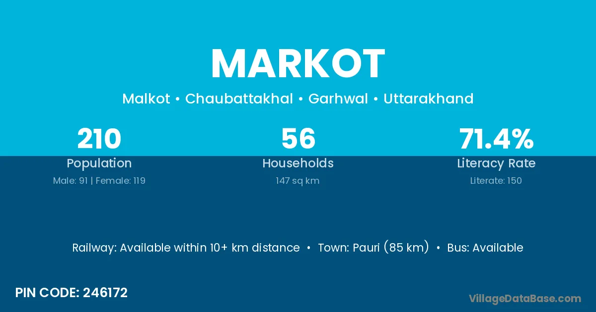 Pauri (85 km) is the nearest town to Markot village for major economic activities and is located approximately 85 km away.