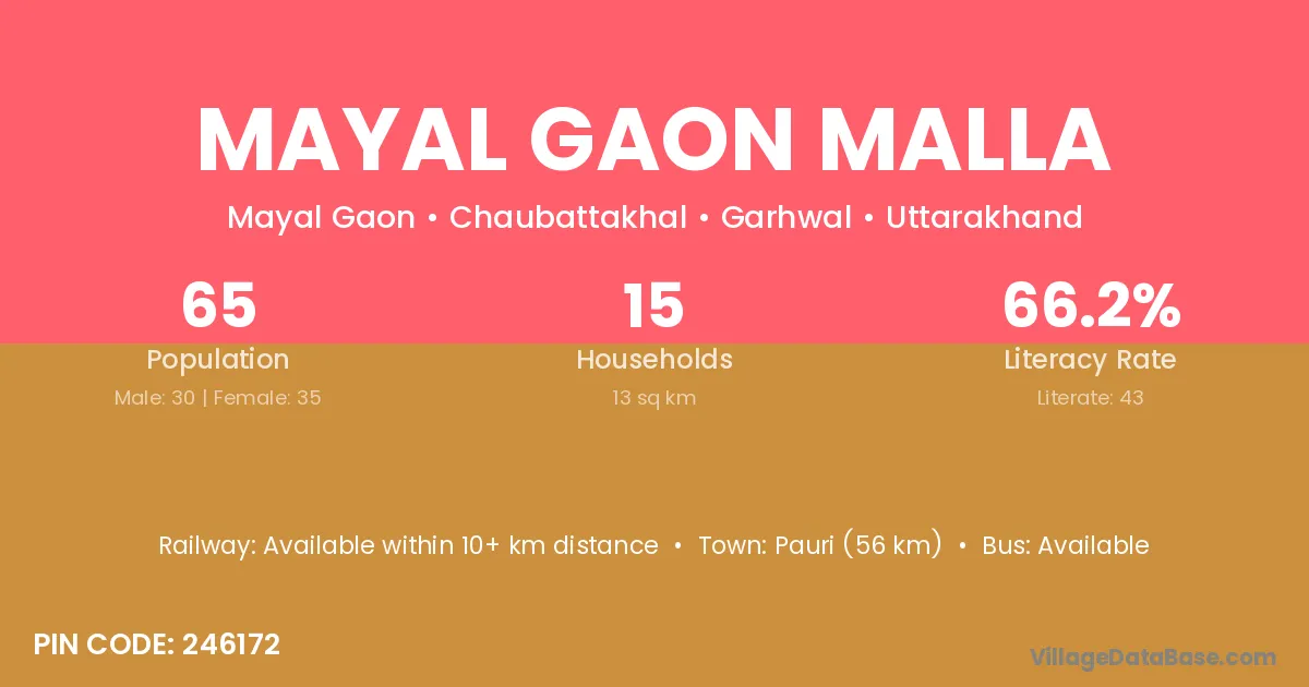 Mayal Gaon Malla village has a total population of 65 people, of which 30 are males and 35 are females.