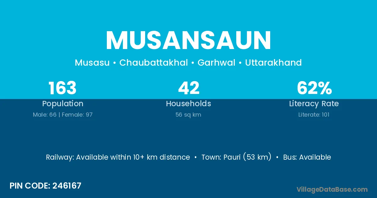 Pauri (53 km) is the nearest town to Musansaun village for major economic activities and is located approximately 53 km away.