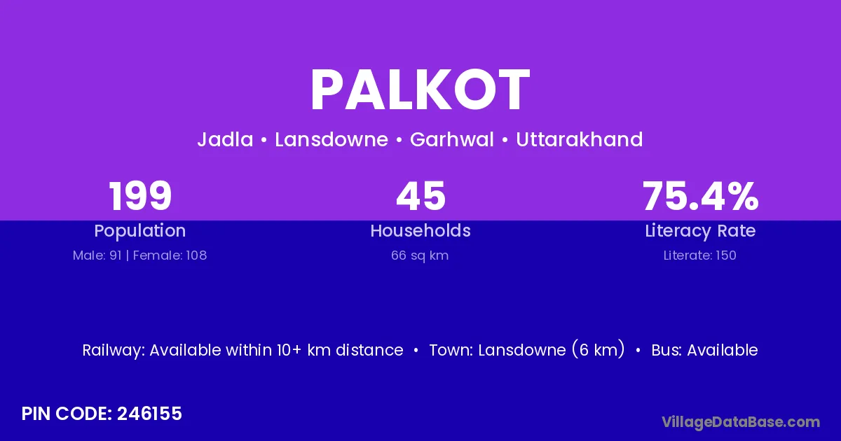 Pauri (58 km) is the nearest town to Palkot village for major economic activities and is located approximately 58 km away.