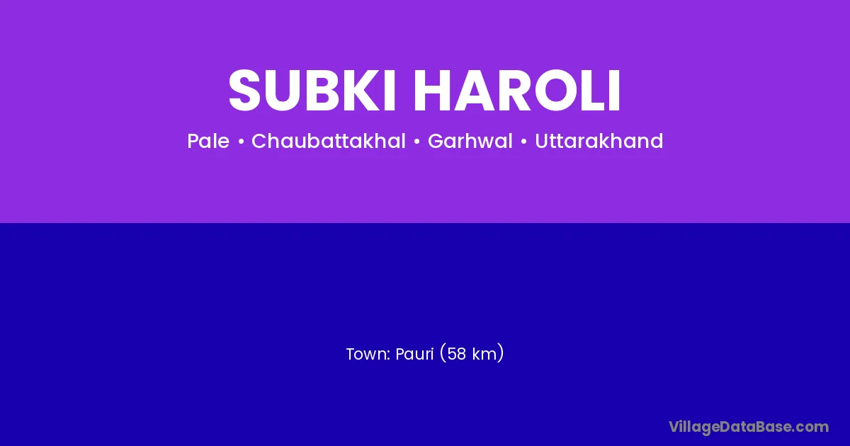 Pauri (58 km) is the nearest town to Subki Haroli village for major economic activities and is located approximately 58 km away.