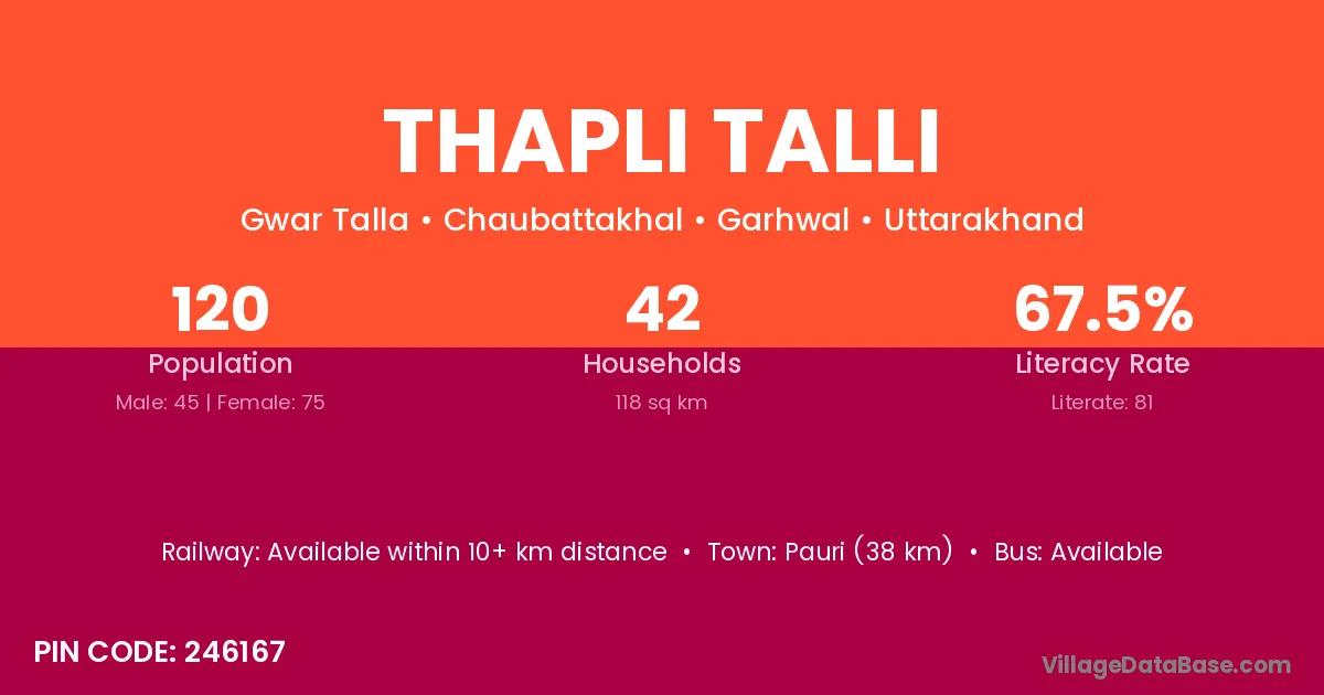 Pauri (38 km) is the nearest town to Thapli Talli village for major economic activities and is located approximately 38 km away.