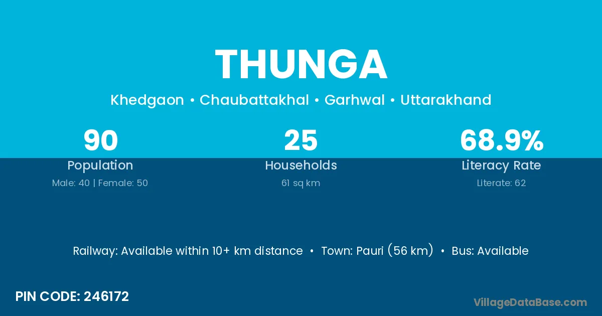 Pauri (56 km) is the nearest town to Thunga village for major economic activities and is located approximately 56 km away.