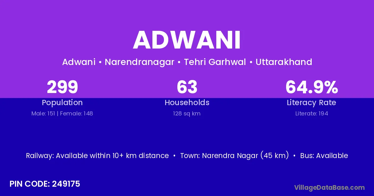 Kotdwara (88 km) is the nearest town to Adwani village for major economic activities and is located approximately 88 km away.