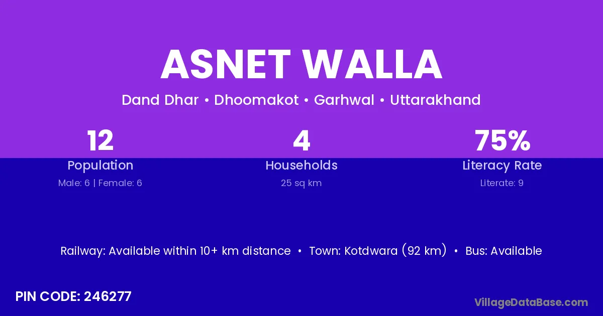 Kotdwara (92 km) is the nearest town to Asnet Walla village for major economic activities and is located approximately 92 km away.