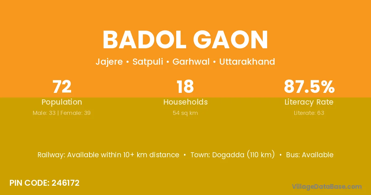 Ramnagar (70 km) is the nearest town to Badol Gaon village for major economic activities and is located approximately 70 km away.