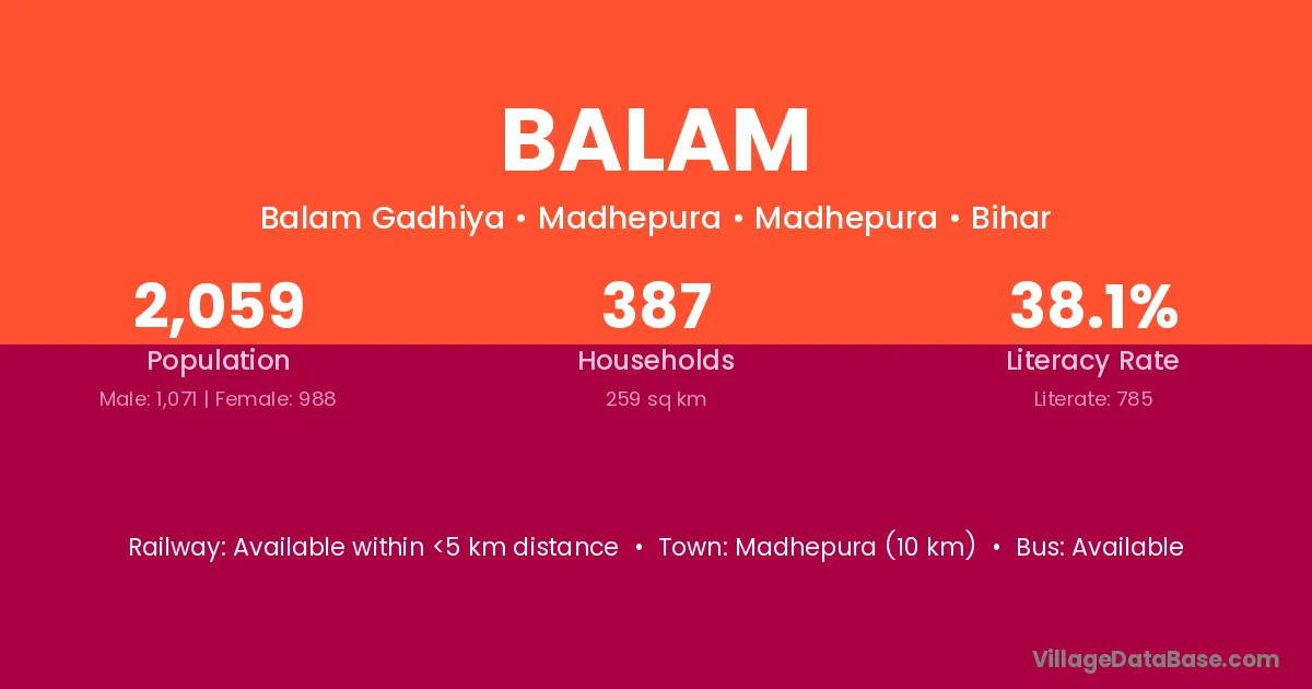The literacy rate of Balam village is 66.67%. Male literacy stands at 71.43% and female literacy at 62.86%.