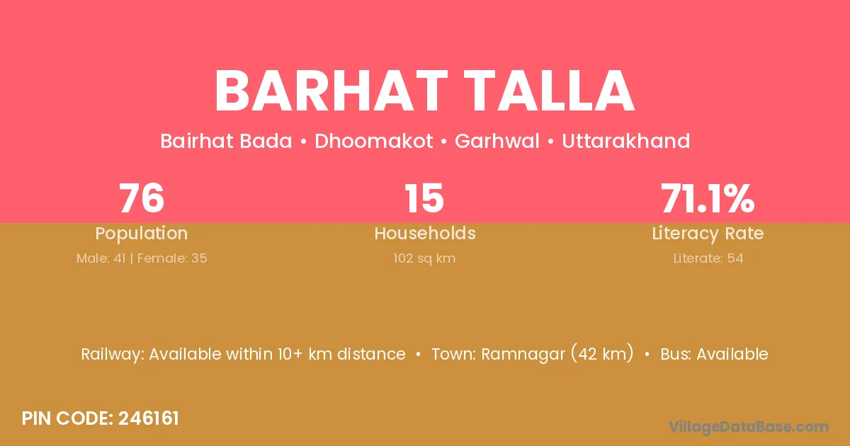 Ramnagar (42 km) is the nearest town to Barhat Talla village for major economic activities and is located approximately 42 km away.