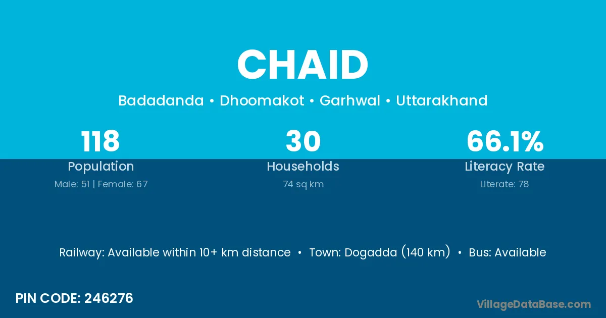 Dogadda (140 km) is the nearest town to Chaid village for major economic activities and is located approximately 140 km away.