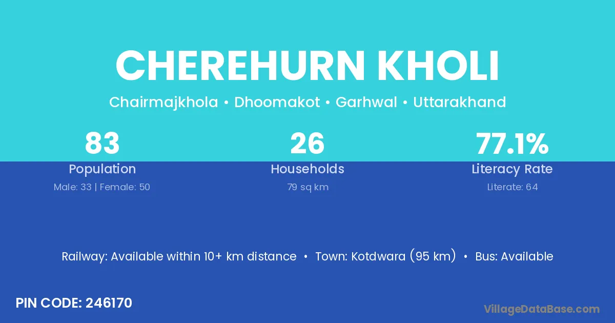 Kotdwara (95 km) is the nearest town to Cherehurn Kholi village for major economic activities and is located approximately 95 km away.