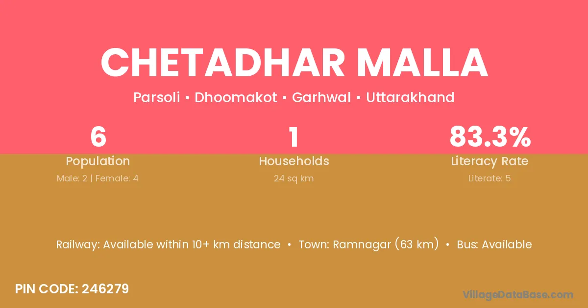 Chetadhar Malla village has a total population of 6 people, of which 2 are males and 4 are females.