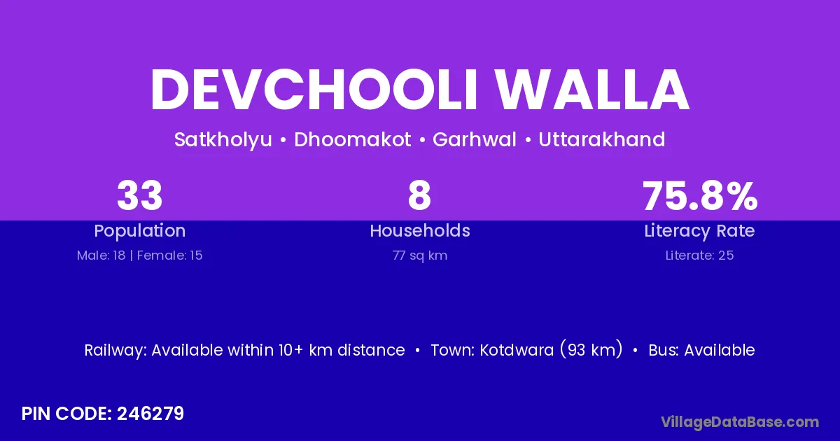 Kotdwara (93 km) is the nearest town to Devchooli Walla village for major economic activities and is located approximately 93 km away.