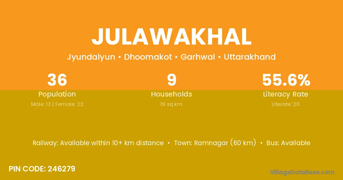 Ramnagar (60 km) is the nearest town to Julawakhal village for major economic activities and is located approximately 60 km away.