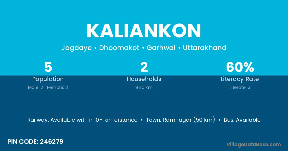 Ramnagar (50 km) is the nearest town to Kaliankon village for major economic activities and is located approximately 50 km away.