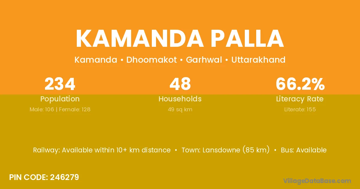 Lansdowne (85 km) is the nearest town to Kamanda Palla village for major economic activities and is located approximately 85 km away.