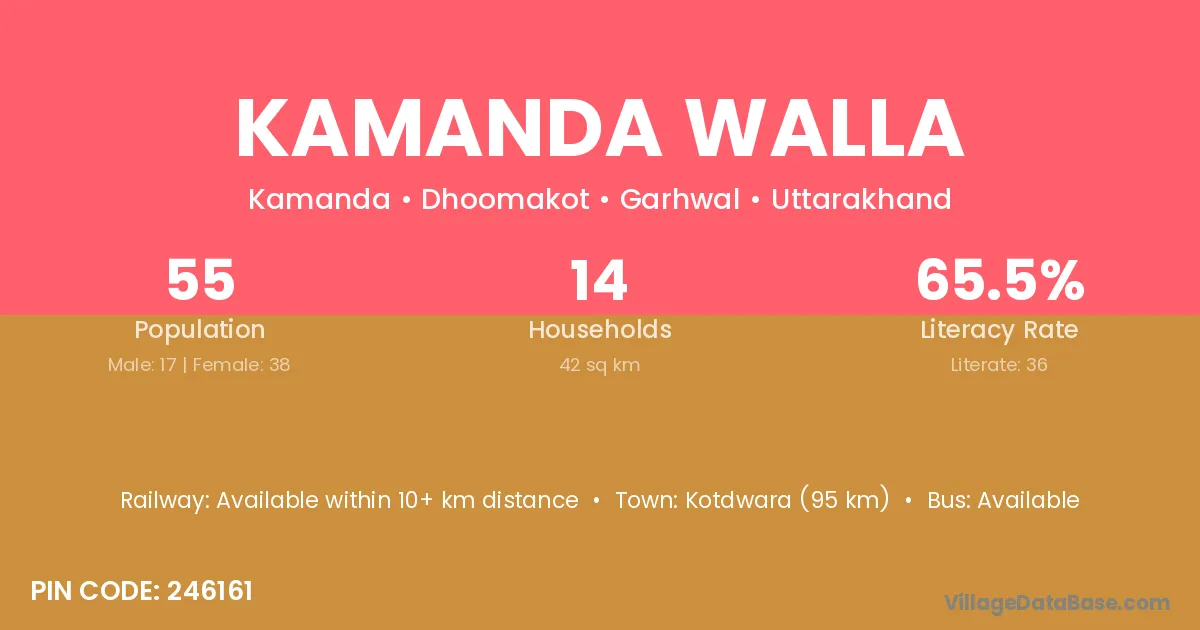 Kotdwara (95 km) is the nearest town to Kamanda Walla village for major economic activities and is located approximately 95 km away.
