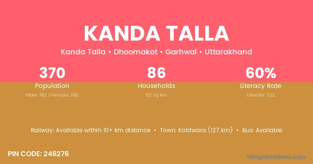 Kotdwara (127 km) is the nearest town to Kanda Talla village for major economic activities and is located approximately 127 km away.