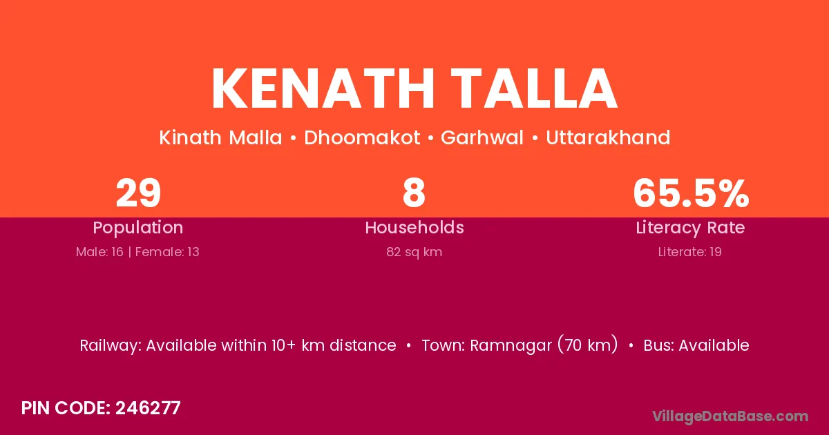 Ramnagar (70 km) is the nearest town to Kenath Talla village for major economic activities and is located approximately 70 km away.