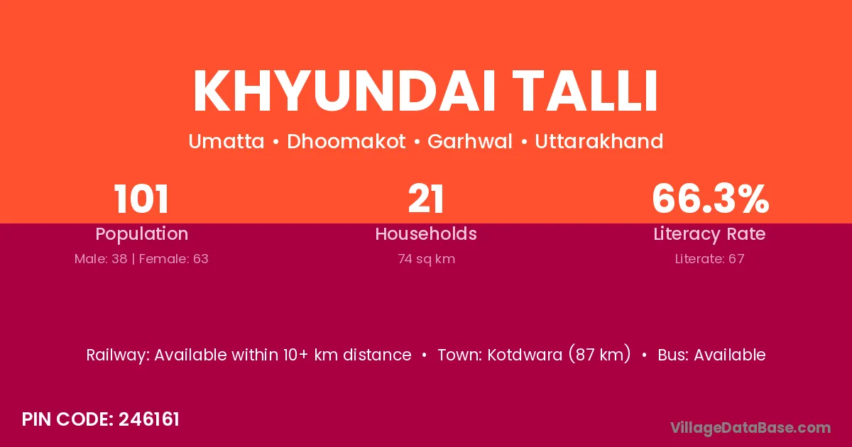 Kotdwara (87 km) is the nearest town to Khyundai Talli village for major economic activities and is located approximately 87 km away.