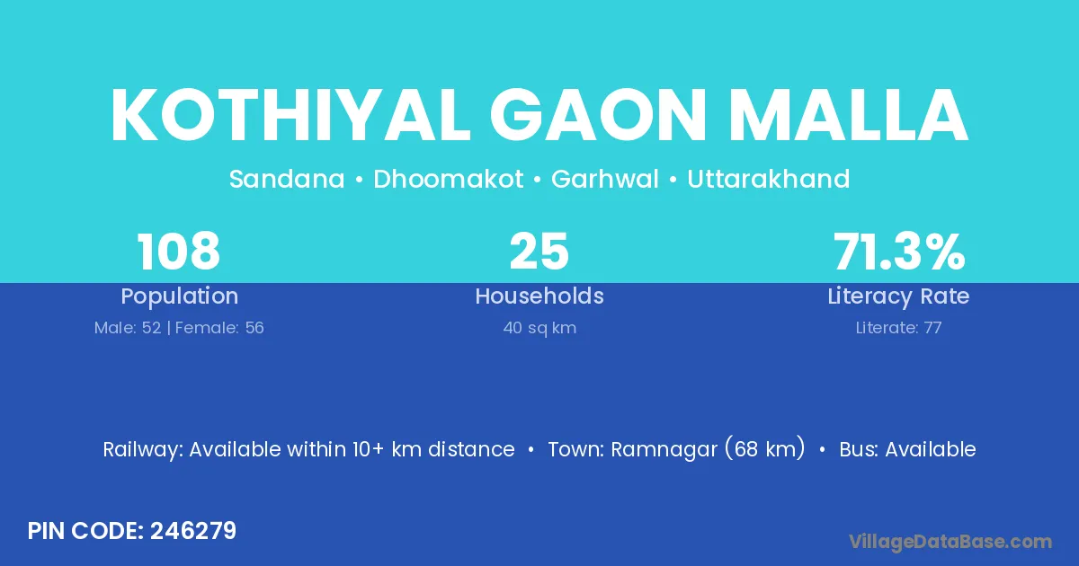Kothiyal Gaon Malla village has a total population of 108 people, of which 52 are males and 56 are females.