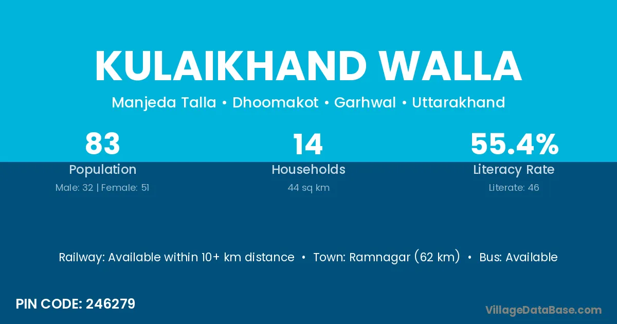Ramnagar (62 km) is the nearest town to Kulaikhand Walla village for major economic activities and is located approximately 62 km away.