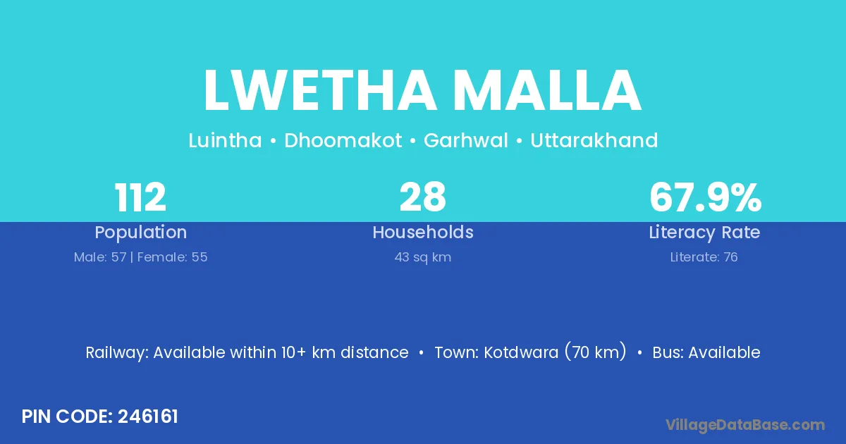 Kotdwara (70 km) is the nearest town to Lwetha Malla village for major economic activities and is located approximately 70 km away.