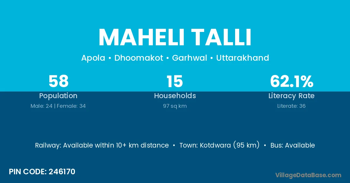 Kotdwara (95 km) is the nearest town to Maheli Talli village for major economic activities and is located approximately 95 km away.