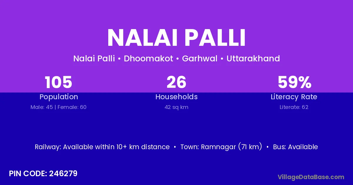 Ramnagar (71 km) is the nearest town to Nalai Palli village for major economic activities and is located approximately 71 km away.