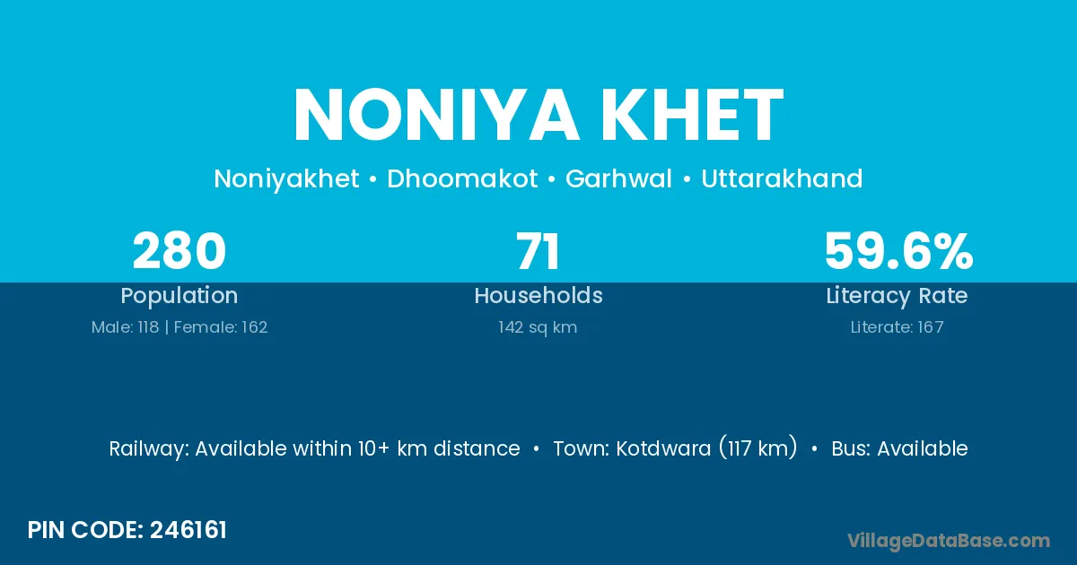 Kotdwara (117 km) is the nearest town to Noniya Khet village for major economic activities and is located approximately 117 km away.