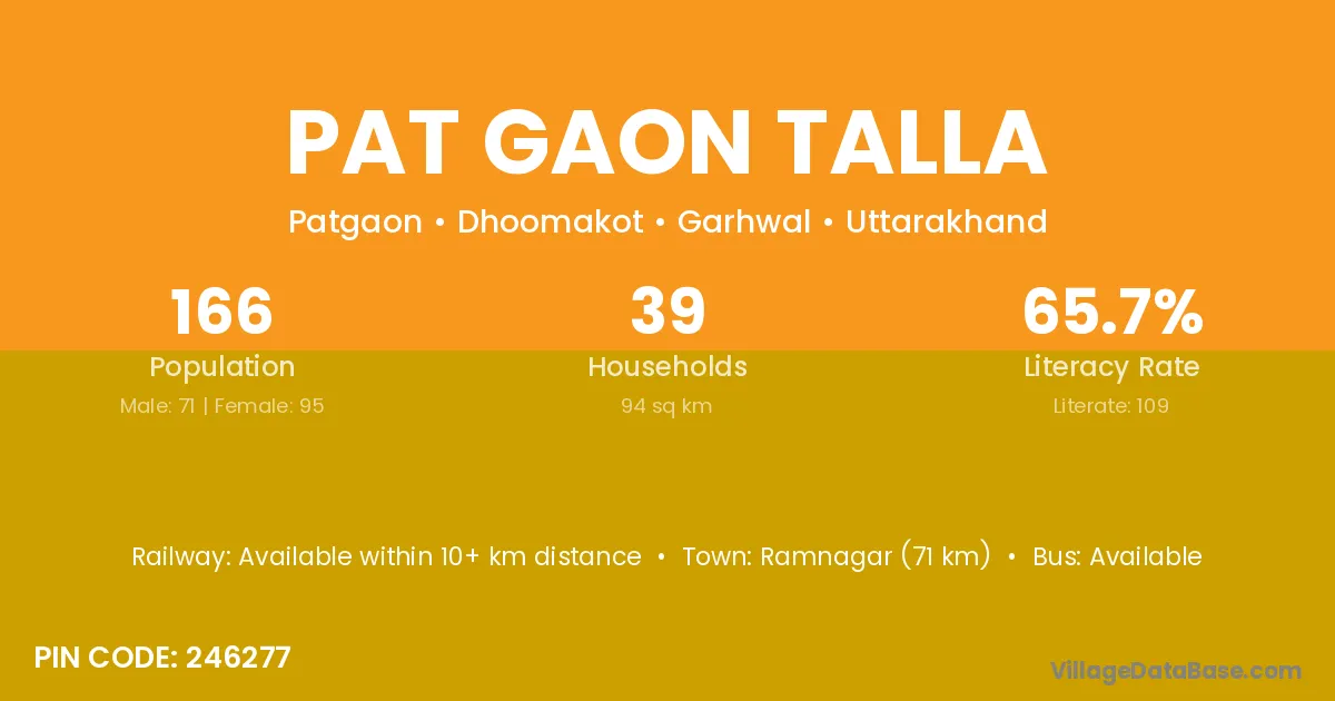 Ramnagar (71 km) is the nearest town to Pat Gaon Talla village for major economic activities and is located approximately 71 km away.