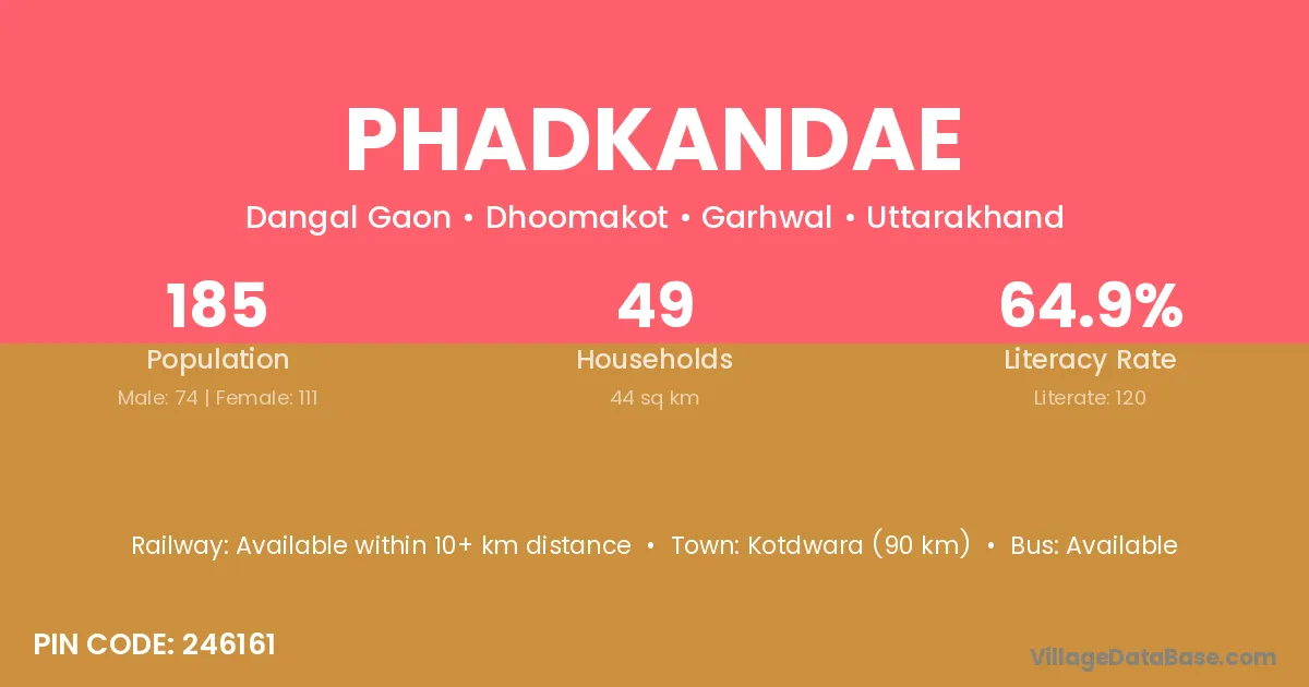 Kotdwara (90 km) is the nearest town to Phadkandae village for major economic activities and is located approximately 90 km away.