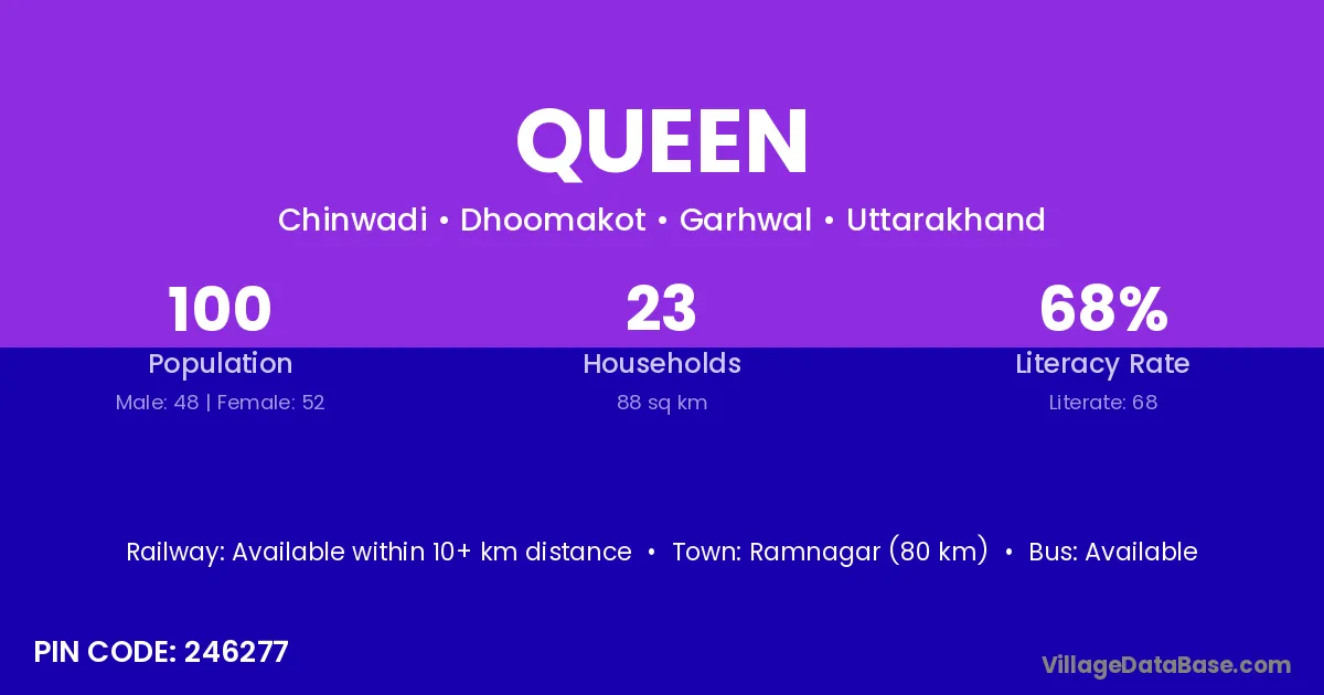 According to Census 2011 information, the village code of Queen village is 246277.