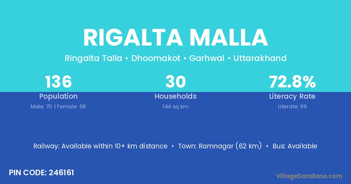 Ramnagar (62 km) is the nearest town to Rigalta Malla village for major economic activities and is located approximately 62 km away.