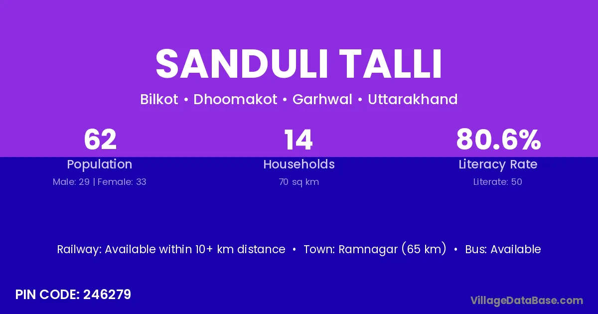 Ramnagar (65 km) is the nearest town to Sanduli Talli village for major economic activities and is located approximately 65 km away.