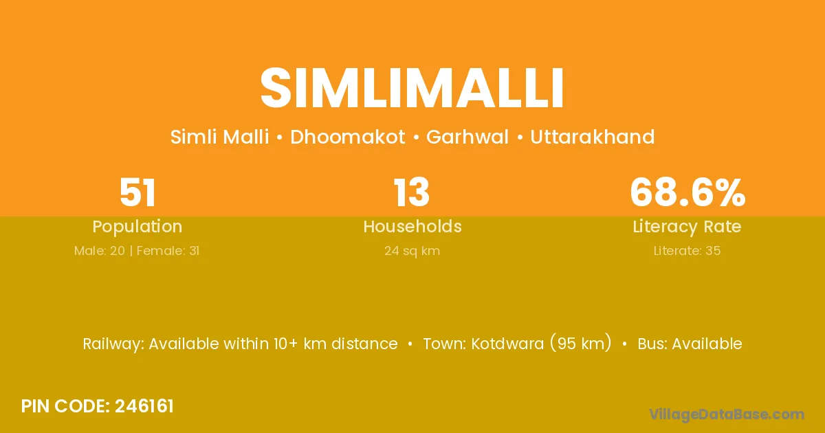 Kotdwara (95 km) is the nearest town to Simlimalli village for major economic activities and is located approximately 95 km away.