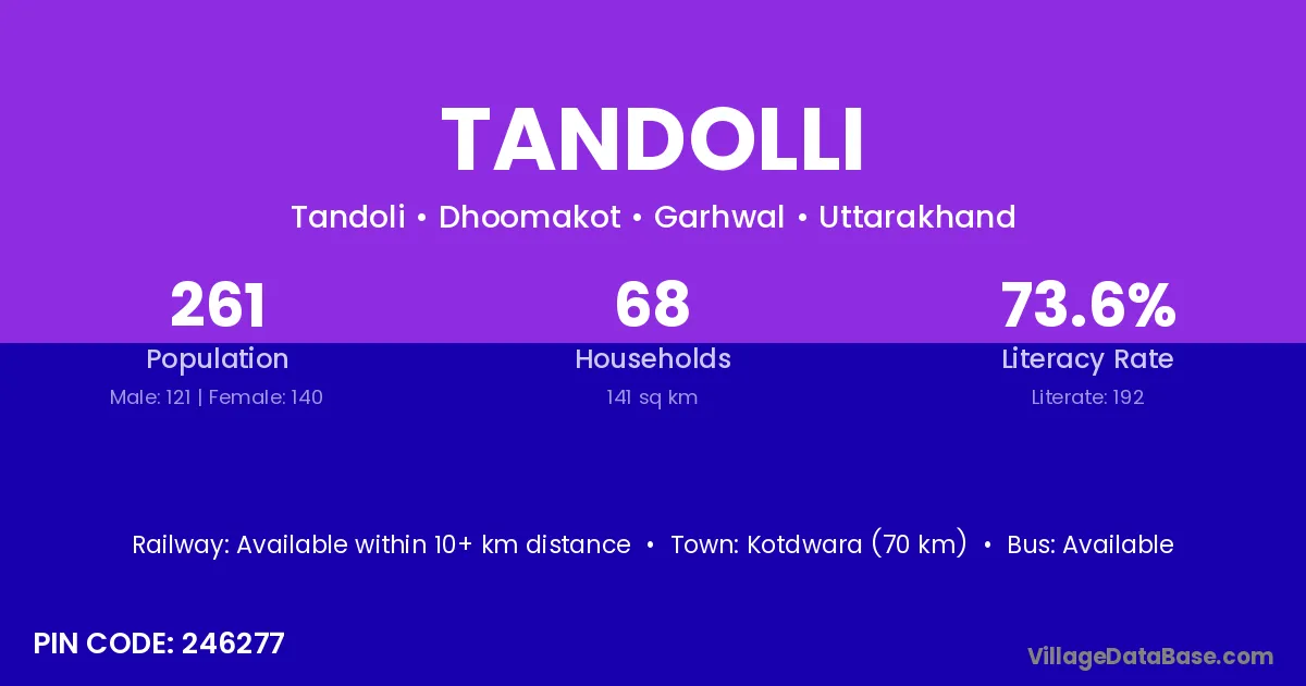Kotdwara (70 km) is the nearest town to Tandolli village for major economic activities and is located approximately 70 km away.