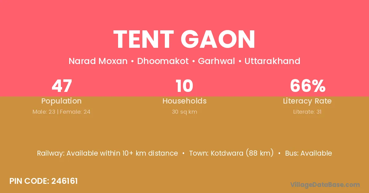 Tent Gaon village has a total population of 47 people, of which 23 are males and 24 are females.