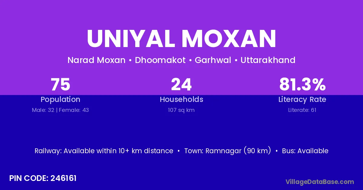 Ramnagar (90 km) is the nearest town to Uniyal Moxan village for major economic activities and is located approximately 90 km away.