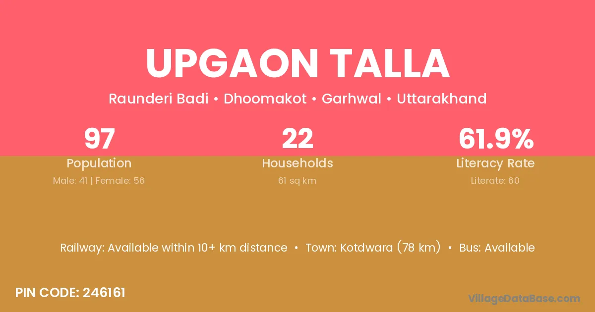 Kotdwara (78 km) is the nearest town to Upgaon Talla village for major economic activities and is located approximately 78 km away.