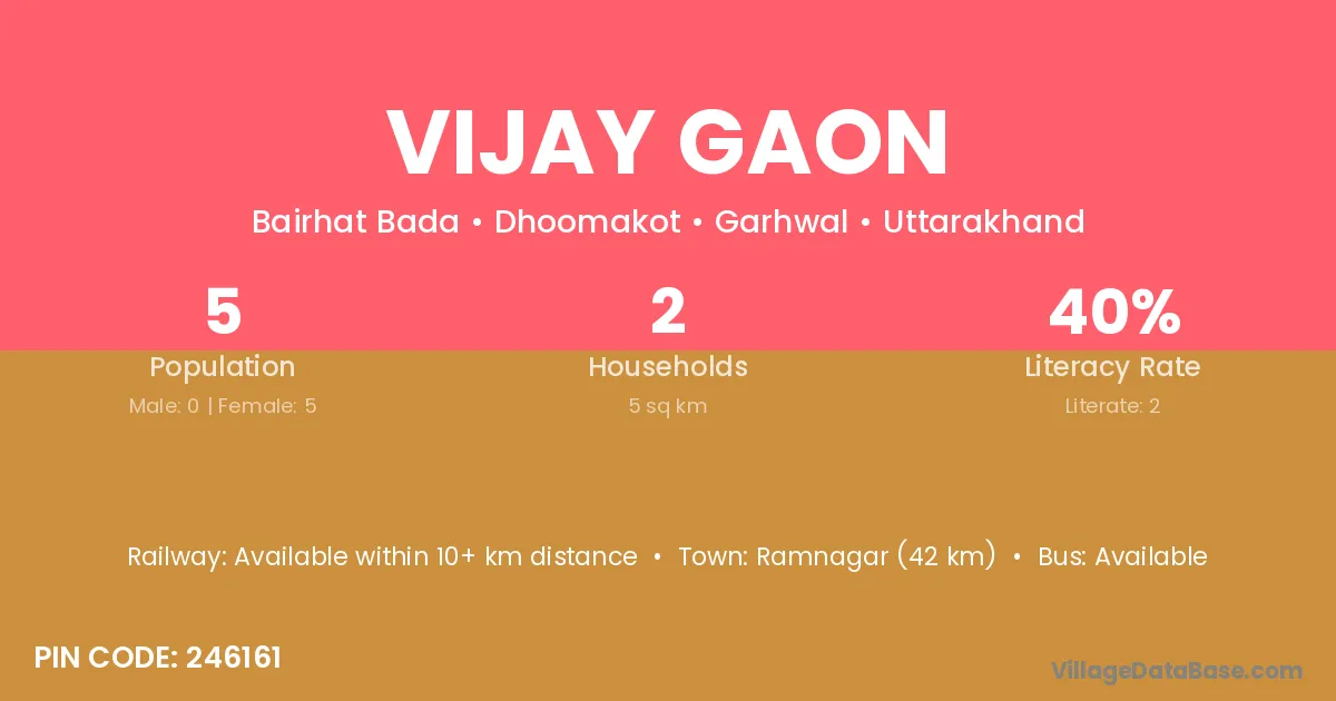 Ramnagar (42 km) is the nearest town to Vijay Gaon village for major economic activities and is located approximately 42 km away.