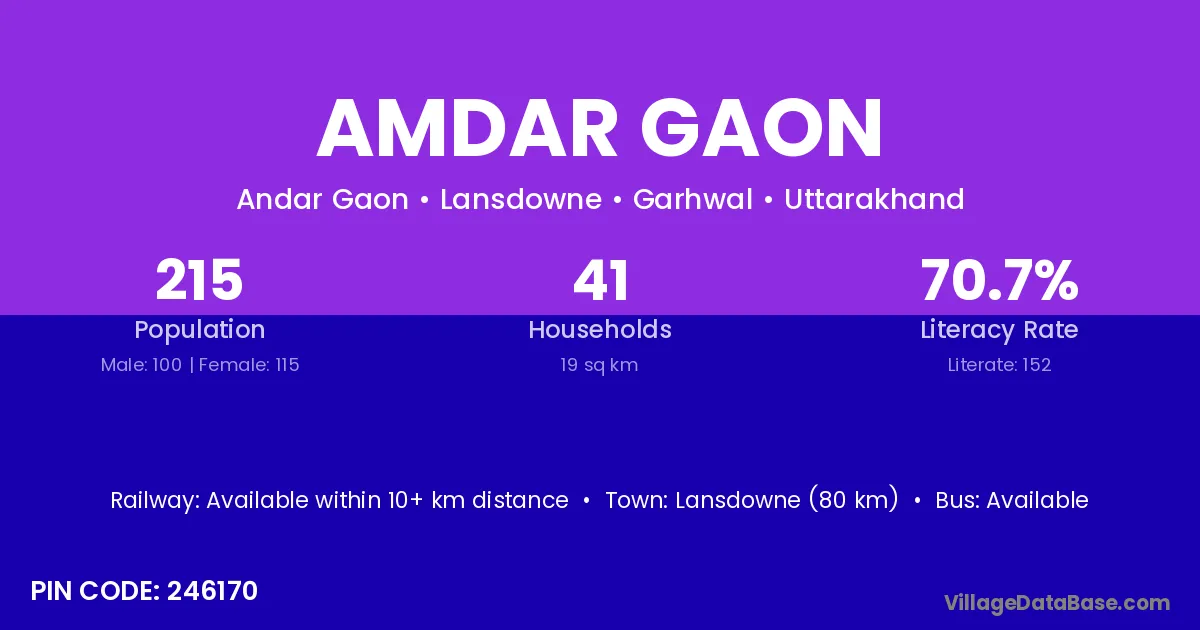 Lansdowne (80 km) is the nearest town to Amdar Gaon village for major economic activities and is located approximately 80 km away.