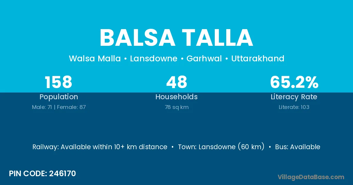 Lansdowne (60 km) is the nearest town to Balsa Talla village for major economic activities and is located approximately 60 km away.