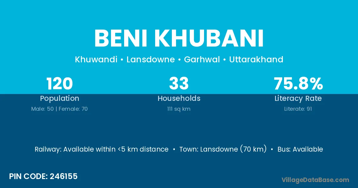 Lansdowne (70 km) is the nearest town to Beni Khubani village for major economic activities and is located approximately 70 km away.