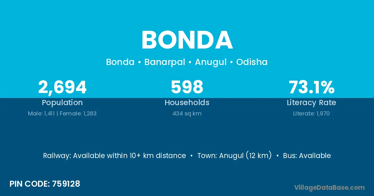 The literacy rate of Bonda village is 76.32%. Male literacy stands at 93.75% and female literacy at 63.64%.