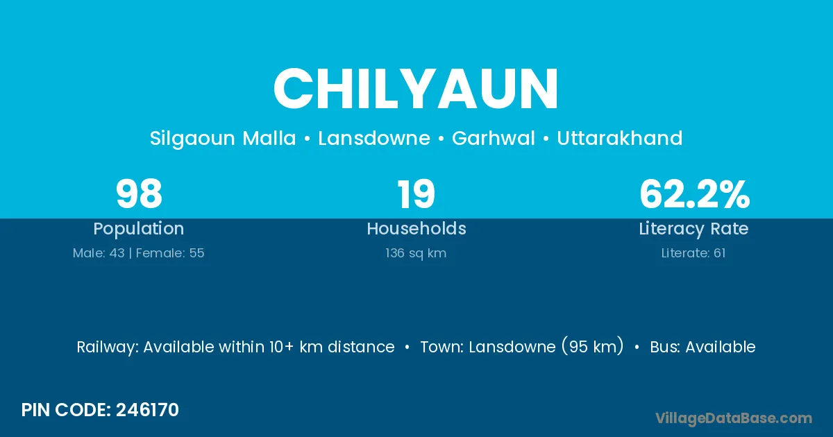 Lansdowne (95 km) is the nearest town to Chilyaun village for major economic activities and is located approximately 95 km away.