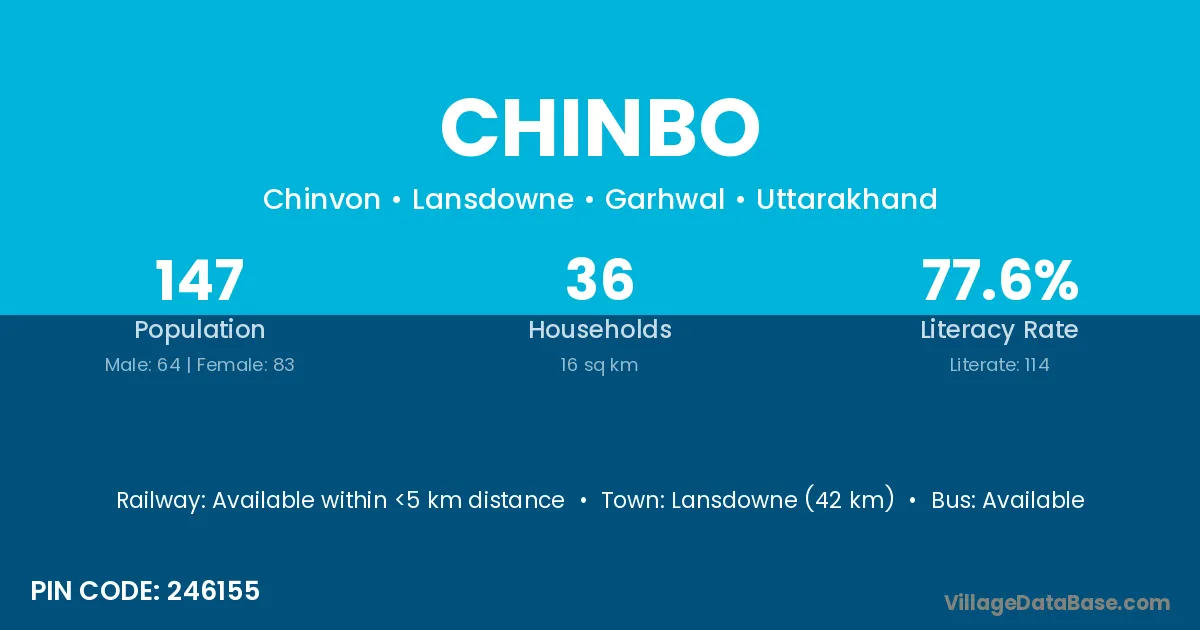 Lansdowne (42 km) is the nearest town to Chinbo village for major economic activities and is located approximately 42 km away.